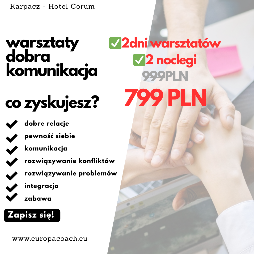 Otwórz się na lepsze relacje dzięki warsztatom „Dobra komunikacja”! Naucz się, jak spokojnie i skutecznie radzić sobie w sytuacjach konfliktowych, zrozumieć siebie i innych oraz budować porozumienie oparte na wzajemnym szacunku.